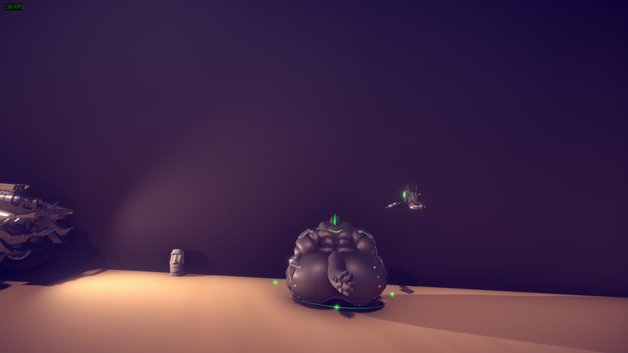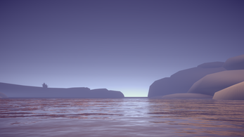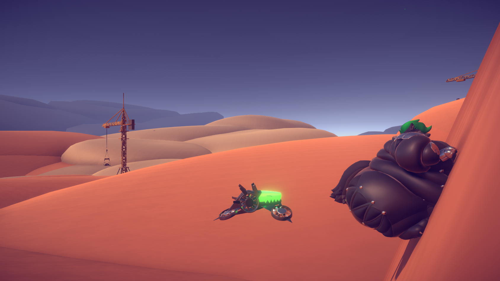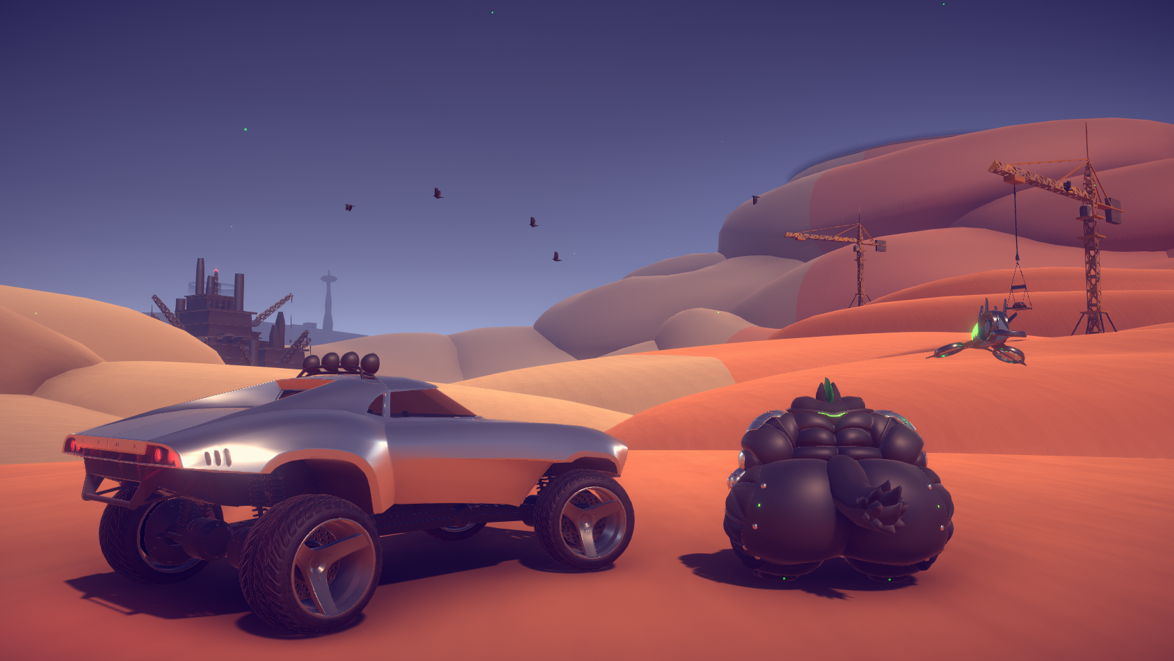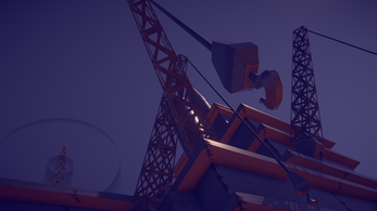 It's an interesting idea, and pretty atmospheric, but I'm not sure what to do other than run/drive around. I went into the 'oil rig' and found a green orb I couldn't interact with, I tried climbing the 'mountain' and hit a dark bubble I could get past, and I drove/swam/ran all the way to this Space Needle-looking tower and tried climbing it until the disc at the top stopped me. Never saw the ship in that one screenshot.